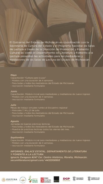 Mayores informes en el Departamento de Literatura y Fomento a la lectura de la Secum ubicado en Ignacio Zaragoza 247, colonia Centro, en Morelia, Michoacán; en el correo [email protected] y en el teléfono 4432308993.