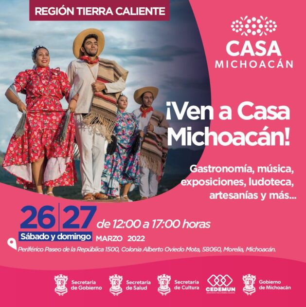 *Morelia, Michoacán, 26 de marzo del 2022.-* Música, danza, artesanías, exposiciones y cocineras tradicionales de la región de Tierra Caliente estarán presentes este 26 y 27 de marzo en Casa Michoacán, recinto que alberga un proyecto impulsado por la Secretaría de Cultura de Michoacán (SECUM) y que abrirá sus puertas de 12:00 a 17:00 horas.