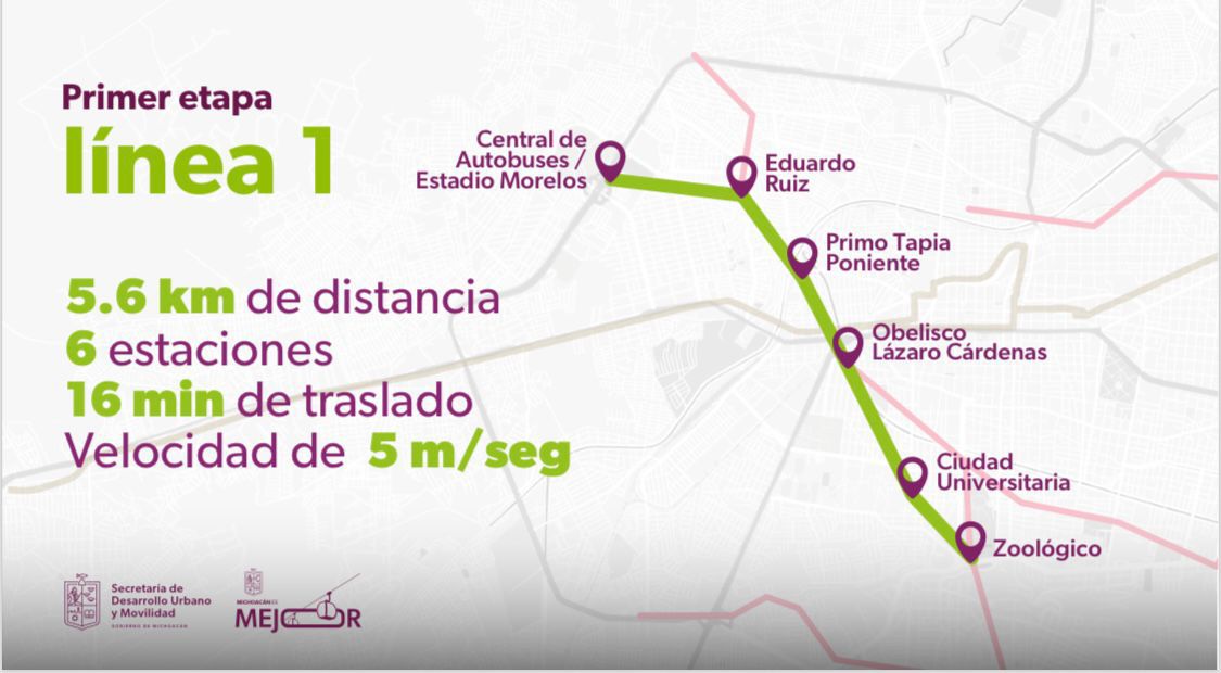 Precisó que la línea 1 de la primera etapa contará con seis estaciones: Estadio Morelos, Eduardo Ruiz, Primo Tapia Poniente, Obelisco, Lázaro Cárdenas, Ciudad Universitaria y Zoológico, que en conjunto suman un trayecto de 5.6 kilómetros de distancia.