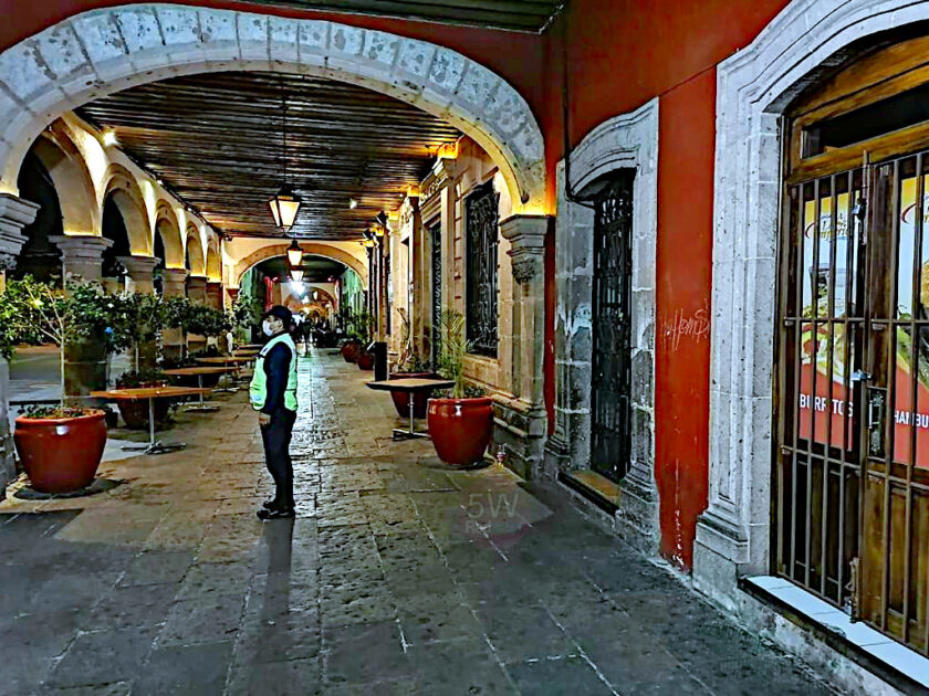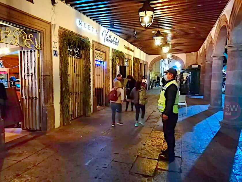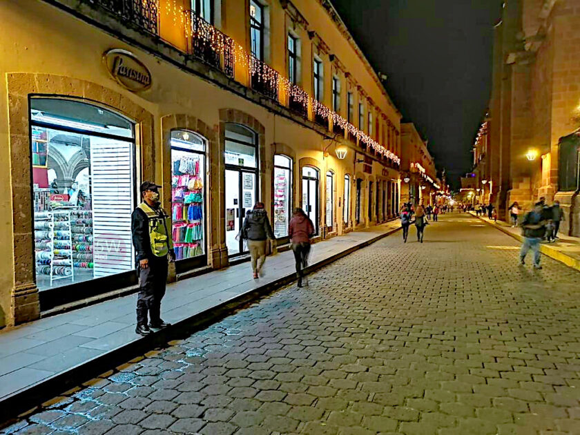 Elementos de la Policía Michoacán efectúan recorridos en establecimientos comerciales, plazas públicas y sitios de mayor afluencia, supervisando que los cierres de las actividades no esenciales, se hayan efectuado desde las 19:00 horas.