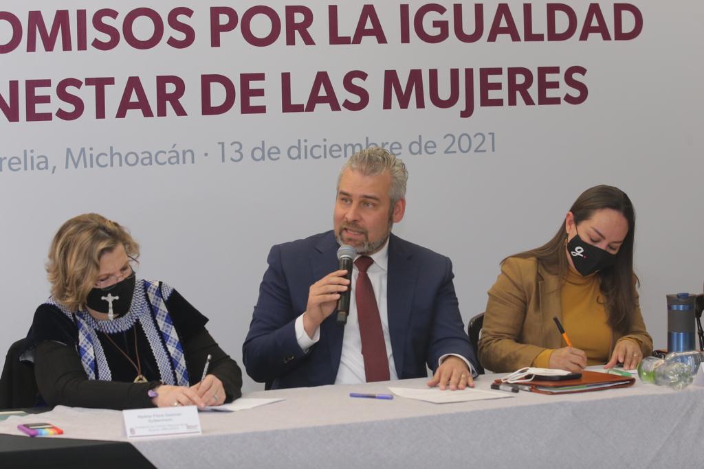 *Morelia, Michoacán, 13 de diciembre del 2021.-* El gobernador Alfredo Ramírez Bedolla, la presidenta del Instituto Nacional de las Mujeres (Inmujeres), Nadine Gasman Zylberman y la diputada local, Adriana Hernández Íñiguez, firmaron compromisos por la igualdad y bienestar de las mujeres para impulsar una agenda común por la defensa de sus derechos y la erradicación de la violencia de género.