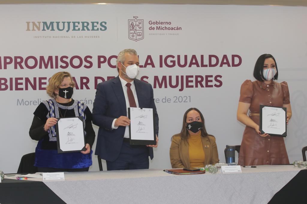 *Morelia, Michoacán, 13 de diciembre del 2021.-* El gobernador Alfredo Ramírez Bedolla, la presidenta del Instituto Nacional de las Mujeres (Inmujeres), Nadine Gasman Zylberman y la diputada local, Adriana Hernández Íñiguez, firmaron compromisos por la igualdad y bienestar de las mujeres para impulsar una agenda común por la defensa de sus derechos y la erradicación de la violencia de género.