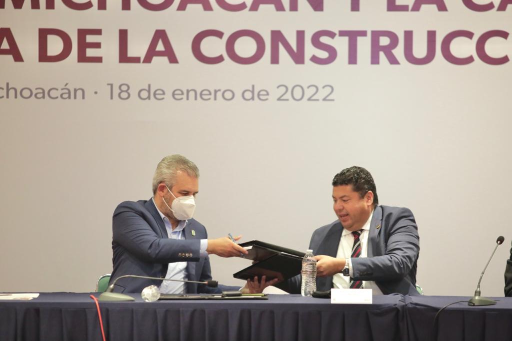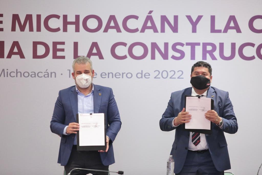 *Morelia, Michoacán, 18 de enero del 2022.-* El gobernador Alfredo Ramírez Bedolla y el presidente de la Cámara Mexicana de la Industria de la Construcción (CMIC), delegación Michoacán, Antonio Jesús Tinoco Zamudio, firmaron convenio de colaboración para impulsar proyectos de infraestructura social y reactivar la economía estatal.