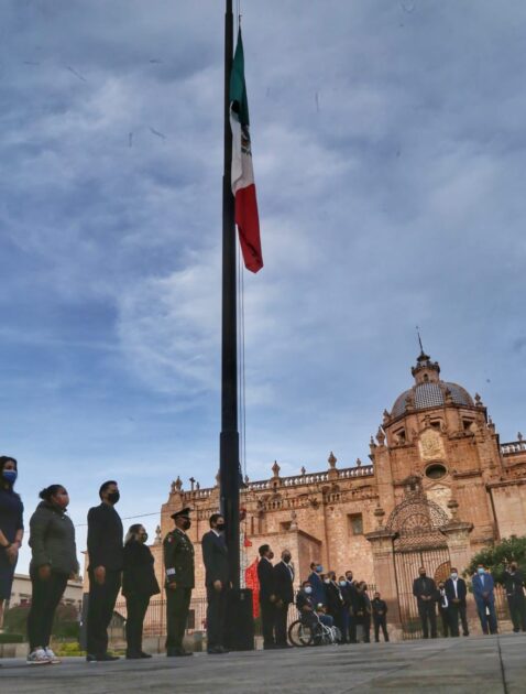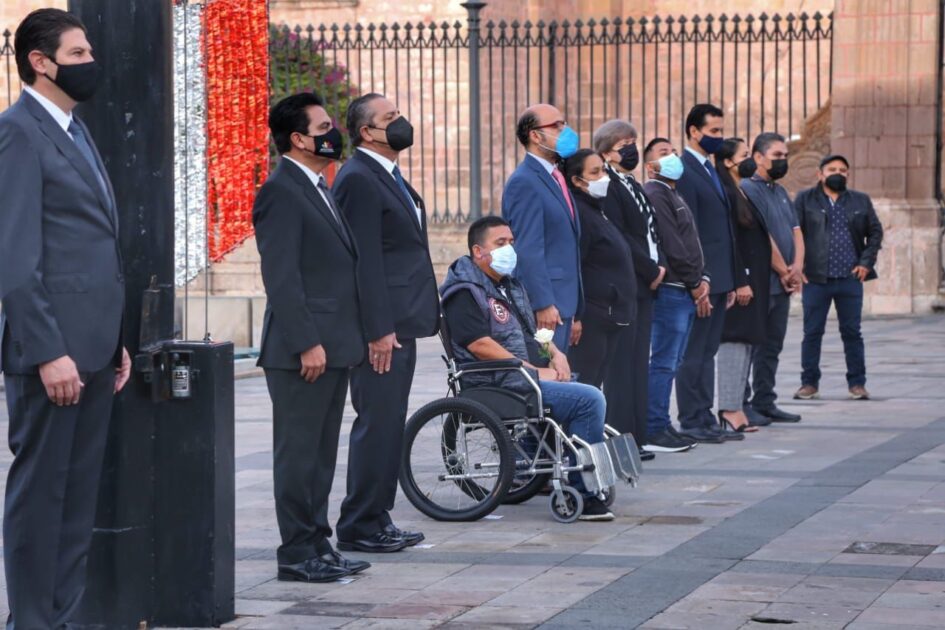En punto de las 8:00 horas en la plaza Melchor Ocampo de la capital michoacana, alzaron la Bandera a media asta en compañía de los familiares de las víctimas del atentado.