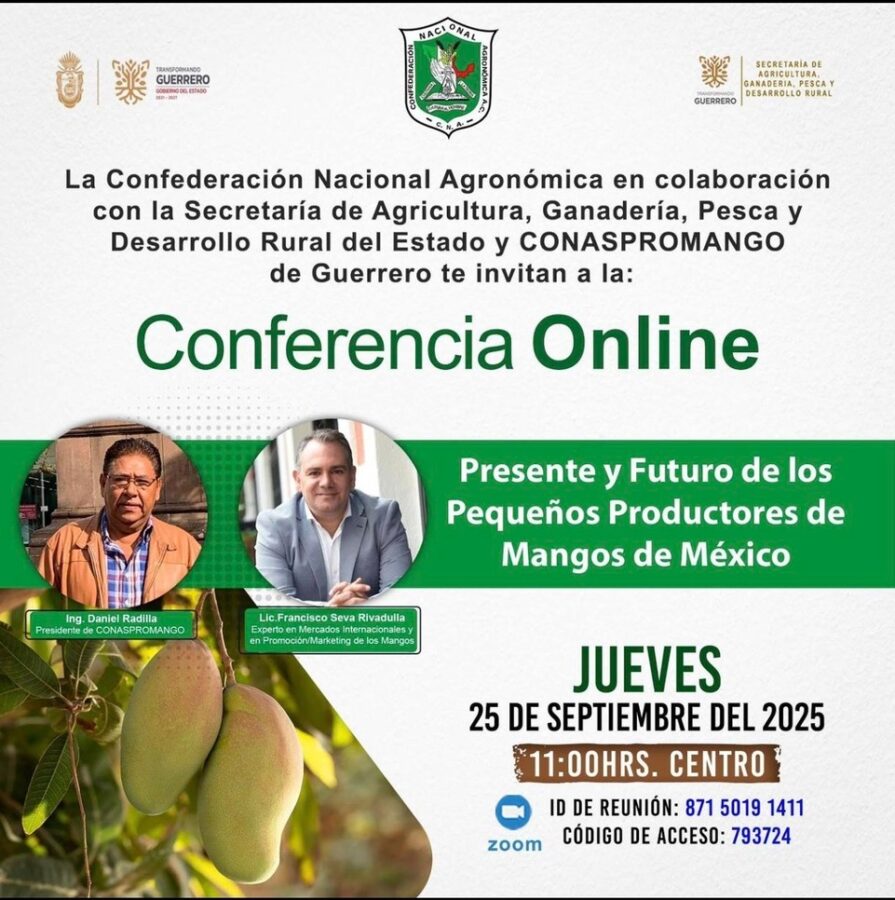 La organización CONASPROMANGO (Comité Nacional de Sistema Producto Mango, A.C.), en colaboración con la Confederación Nacional Agronómica y la Secretaría de Agricultura de Guerrero, llevará a cabo el próximo 25 de septiembre la Jornada Digital “Presente y Futuro de los Pequeños Productores de Mangos de México”, un evento gratuito y abierto al público a través de Zoom.