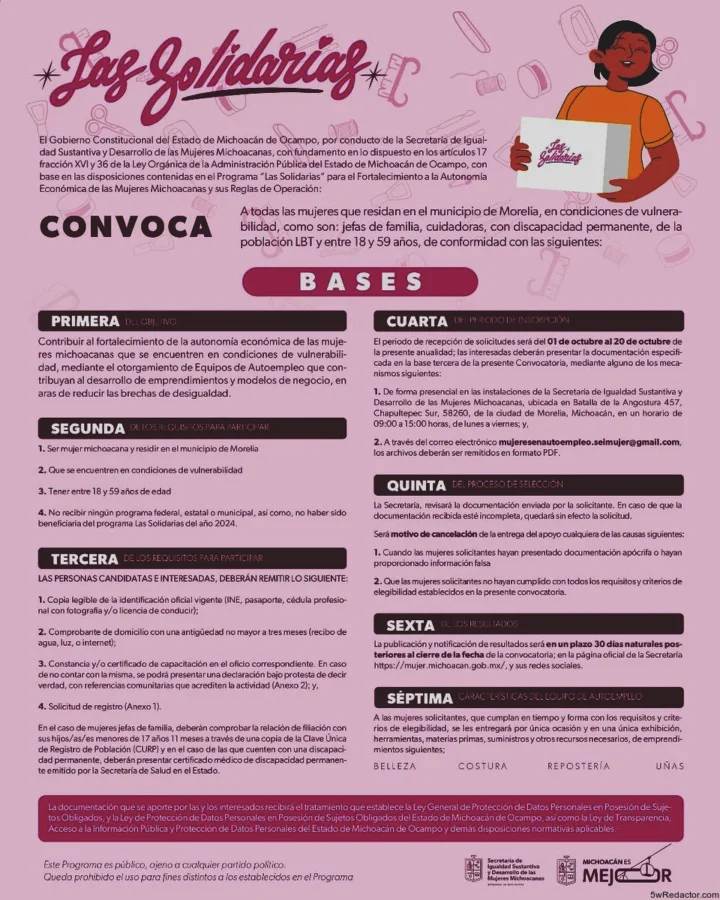 La Secretaría de Igualdad Sustantiva y Desarrollo de las Mujeres Michoacanas (Seimujer) lanzó la convocatoria “Las Solidarias 2025”, un programa que busca apoyar a más de 700 mujeres de Morelia para que puedan emprender o fortalecer un pequeño negocio mediante la entrega de equipos y herramientas de trabajo.