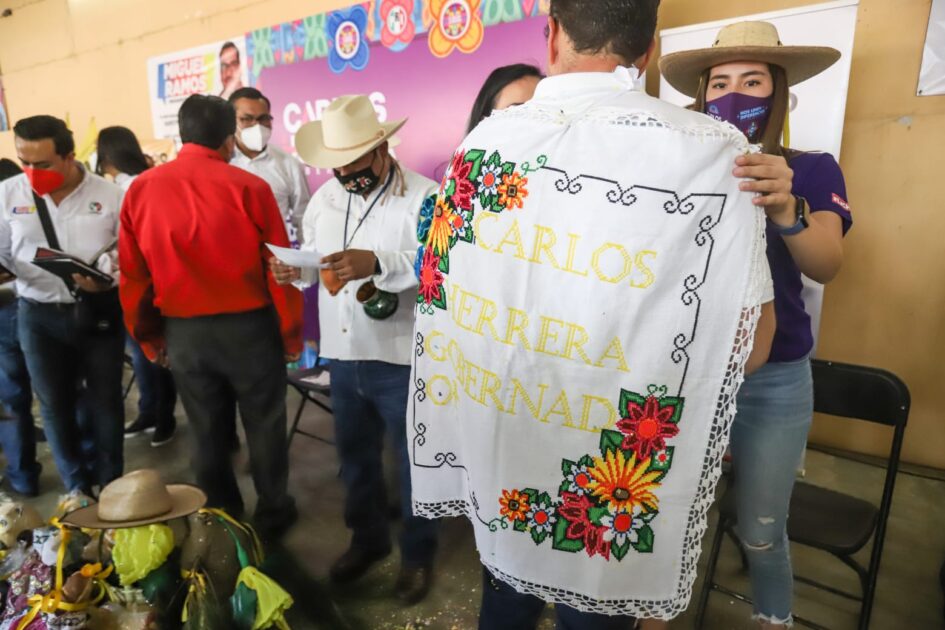 Llenándolo de porras en purépecha, Ixu jini tata Herrera andaat (aquí, allá, Herrera ganará), decenas de personas de la Cañada de los Once Pueblos colocaron cuelgas al candidato, mismas que son elaboradas por manos artesanales con la peculiaridad de cada pueblo o comunidad.