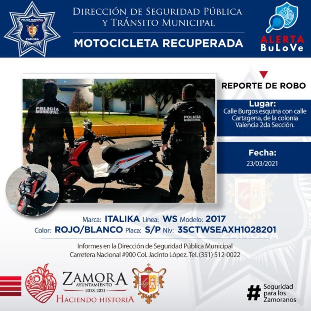 24 de marzo de 2021; Zamora, Mich.- Como parte de las acciones operativas del programa de Búsqueda y Localización de Vehículos con reporte de robo (BuLoVe) de la Dirección de Seguridad Pública y Tránsito Municipal se reporta la recuperación de 5 motocicletas durante la semana del 15 al 21 de marzo. Para más información sobre los vehículos recuperados acudir a Tránsito Municipal.