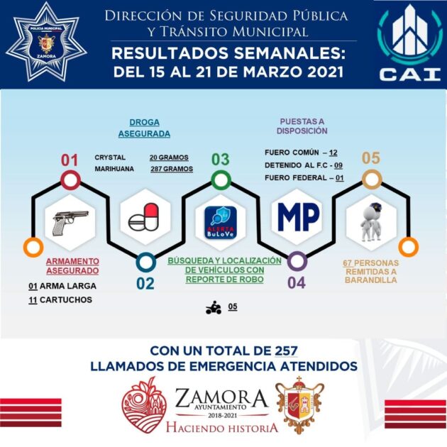 Además, se logró asegurar 1 arma larga y 11 cartuchos útiles; también se aseguró 287 gramos de Marihuana y 20 gramos de metanfetamina. Como resultado de estas acciones, 67 personas fueron remitidas a barandilla, de los cuales 12 fueron puestas a disposición de un juez por delitos del fuero común y uno por fuero federal. En total, se atendieron 257 llamados de emergencia.