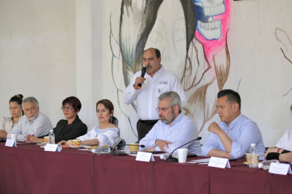 *Tangancícuaro, Michoacán, 11 de marzo del 2022.-* En reunión de trabajo con los cabildos de Jacona y Tangancícuaro, el gobernador Alfredo Ramírez Bedolla aseguró que solo con unidad, trabajo coordinado y disciplina, se logrará preservar la paz y estabilidad para las y los michoacanos.