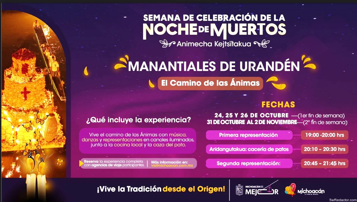 Los Manantiales de Urandén se preparan para recibir nuevamente la Semana de Celebración de la Noche de Muertos, una experiencia mágica que combina tradición, cultura y naturaleza. La Secretaría de Turismo de Michoacán (Sectur), encabezada por Roberto Monroy García, invita a locales y visitantes a disfrutar de esta festividad llena de música, talleres, danzas y recorridos por canales iluminados.